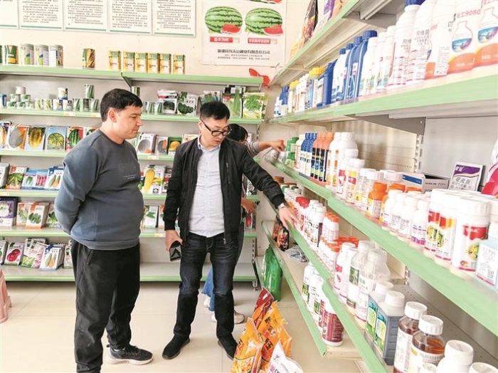 兵团畜牧兽医站工作人员在六师五家渠市农资店开展农资专项检查(资料图片)。日前,兵团各级农业农村部门前往各师市农资店组织开展飞行检查,确保兵团农资市场规范运营,让职工群众用上放心种、放心药、放心肥。淮振杰 摄