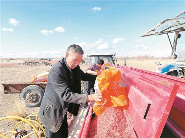 十师一八八团春小麦播种现场,职工在往播种机里加小麦种子(摄于3月20日)。今年,十师北屯市各团场在引进优质高产小麦品种的基础上,大力提高粮食生产标准化和机械化水平,加快小麦缩行增密匀播播种技术推广应用,不断提高土地资源利用率及小麦出苗率,深入推动小麦单产、品质提升,守牢粮食安全底线。 兵团日报全媒体记者 段若冰 摄
